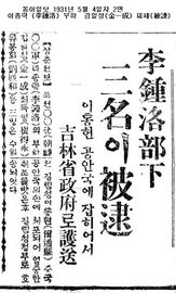 이종락(李鐘洛, 1907~1940)의 부하 김일성(金一成)이 체포되었다는 1931년 3월 26일자 및 5월 4일자 동아일보 기사와 3월 26일자 조선일보 기사.