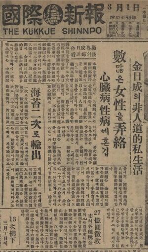 - 在日統一(재일통일)일보 報道(보도) 金日成(김일성)후계에 次男(차남) 正一(정일)옹립 北傀(북괴) 權力闘争(권력투쟁) 격화 1974.04.09 경향신문 1면