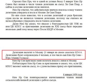 영역 : The delegation will fly to Moscow on January 23 on its IL-14 aircraft. The delegation will be accompanied by 6 people, including the son of Kim Il Sung - Yura / a student of grade 9 /.김정일이 이때 김일성을 따라 소련에 갔다는 것은 당시 동행했던 황장엽(黃長燁)도 후일 한국으로 망명해서 증언한 바 있다.[18][19][20][21]