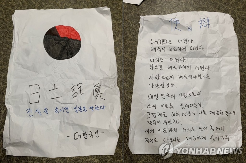 낙성대경제연구소 관계자는 28일 연합뉴스와 한 통화에서 "건물주가 오늘 오전에 2층에 있는 연구소에서 오물과 낙서를 확인했다"며 "현재 폐쇄회로(CC) TV를 볼 수 있는 사람이 없어 범인이 누구인지는 모르겠지만, 반일 종족주의 내용에 반대하는 사람의 소행인 듯하다"고 말했다. 2019.8.28